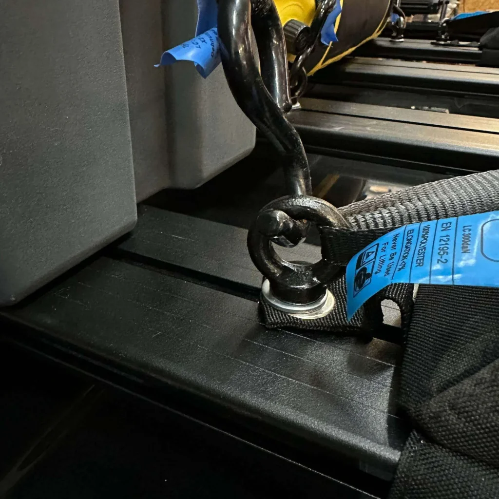 Die umlaufenden Nuten im Rahmen sorgen für flexible Befestigungsmöglichkeiten. Dadurch kannst du Halterungen, Kisten oder Taschen so positionieren, dass der Platz optimal genutzt wird und dein Equipment jederzeit griffbereit ist.